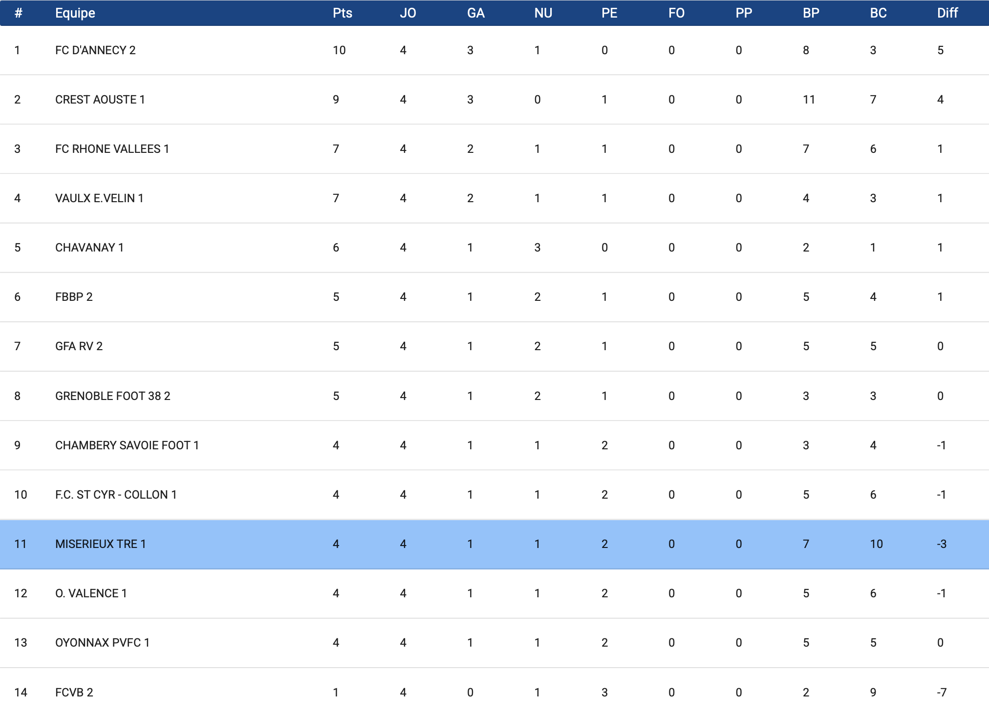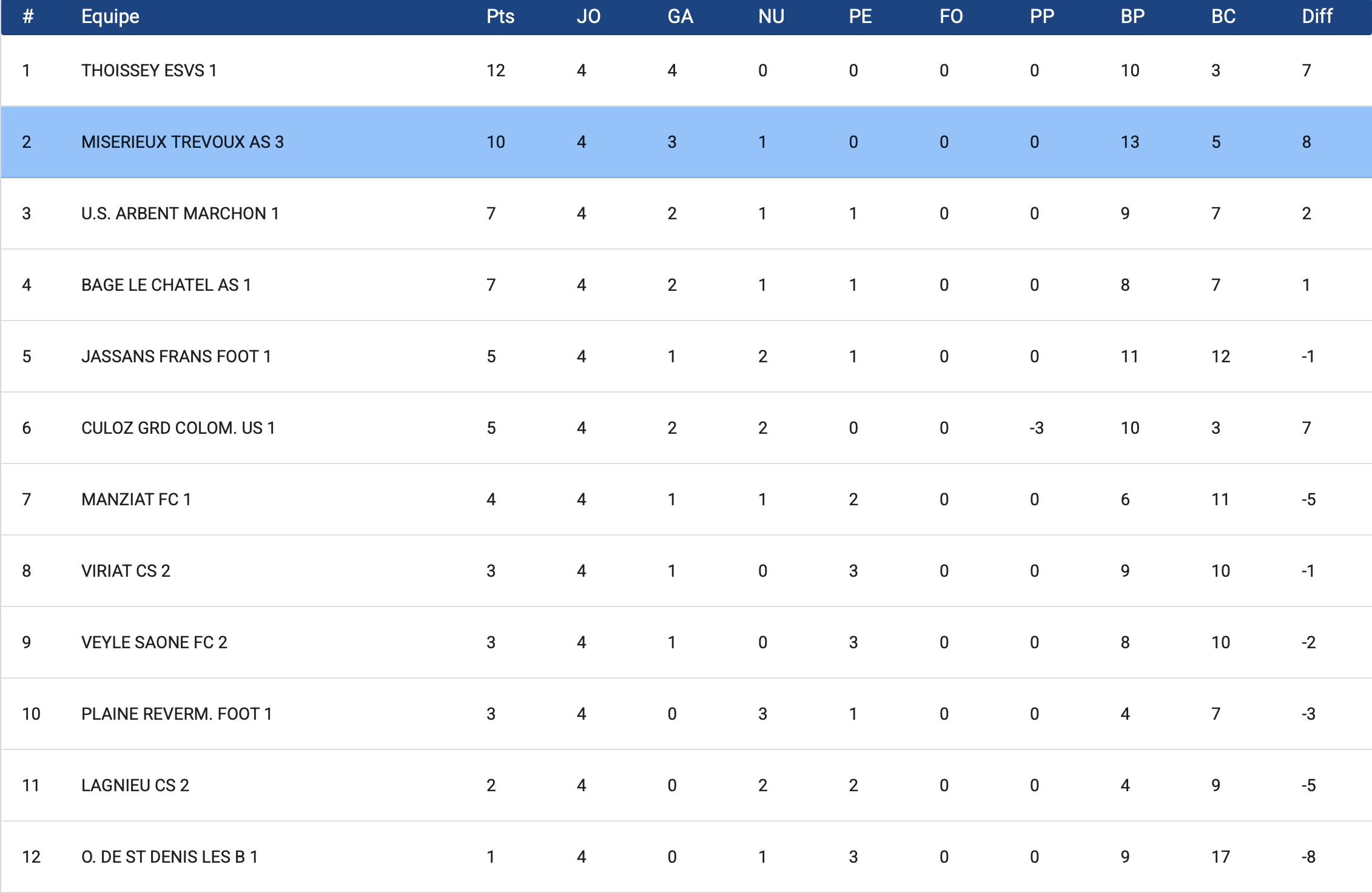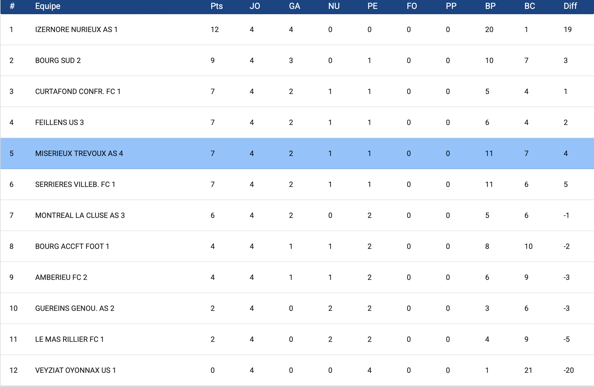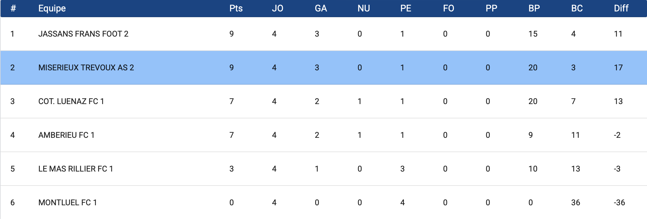 Renato DOS SANTOS : « Après avoir fait notre 1er victoire en championnat on se devait de lancer une série. Donc pour cette 4eme journée de championnat, on c’est déplacé à Amberieu qui avait les mêmes résultats que nous et étaient devant nous au classement. Tout les joueurs ont été concernés par ce match. Malgré une première mi-temps un peu en dessous, nous arrivons a marquer le but du 1-0. Au retour de la mi-temps les joueurs sont revenus sur le terrain avec une mentalité complètement différente et beaucoup plus combative. Nous arrivons donc à marquer le 2 et le 3-0 qui ont quand même pris du temps à arriver. Cependant on prend but sur un peno malchanceux mais on réagit très bien en marquant 2 buts dans la foulée. Merci à tous les joueurs d’avoir répondu présent et de s’être donné à 100 et 200% et un grand merci à Louis d’avoir fait gardien. »